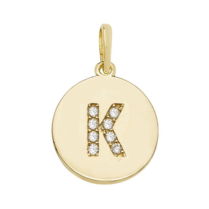 9ct gold 12mm Cubic zirconia round disc initial K pendant.