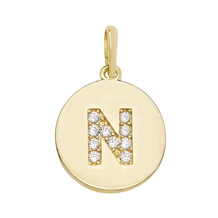 9ct gold 12mm Cubic zirconia round disc initial N pendant.