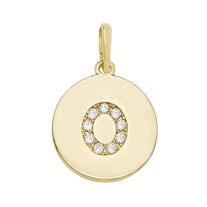 9ct gold 12mm Cubic zirconia round disc initial O pendant.