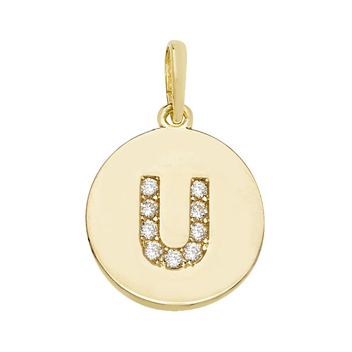 9ct gold 12mm Cubic zirconia round disc initial U pendant.