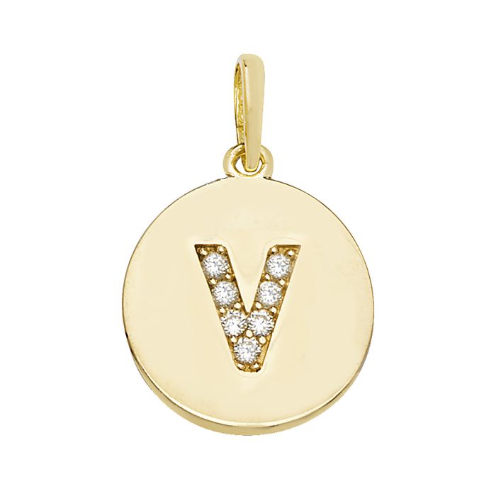 9ct gold 12mm Cubic zirconia round disc initial V pendant.