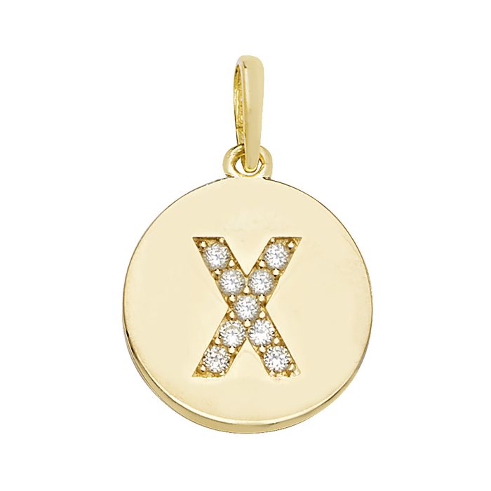 9ct gold 12mm Cubic zirconia round disc initial X pendant.