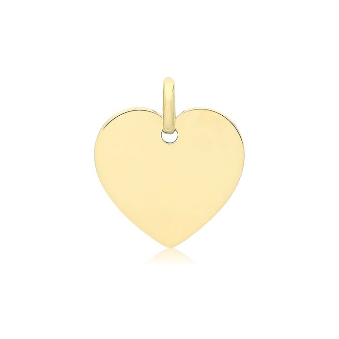 9ct gold 12mm plain heart dog tag pendant.Approximate pendant height 12mm (excluding bale) x width 12mm.Approximate pendant weight is 0.39 grams.If a chain is selected it will be a 9ct gold 1.2mm wide trace chain.The pendant will come to you in a black leatherette gift box with a World of Jewellery cleaning cloth.