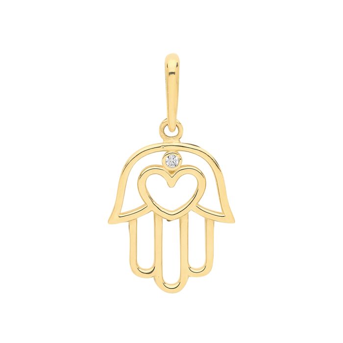 9ct gold 13mm single cubic zirconia heart hamas hand pendant.