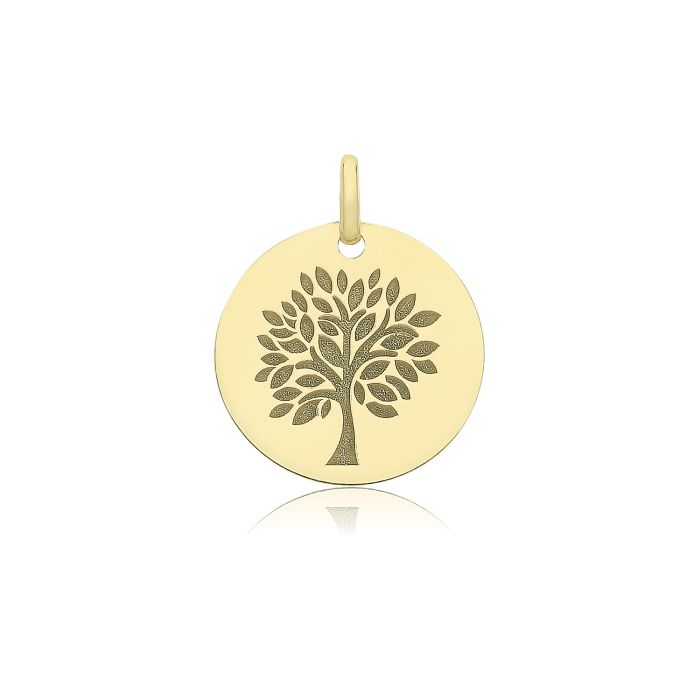 9ct gold 15mm round engraved tree of life pendant.Approximate pendant height 15mm (excluding bale) x width 15mm.Approximate pendant weight is 0.56 grams.If a chain is selected it will be a 9ct gold 1.2mm wide trace chain.The pendant will come to you in a black leatherette gift box with a World of Jewellery cleaning cloth.