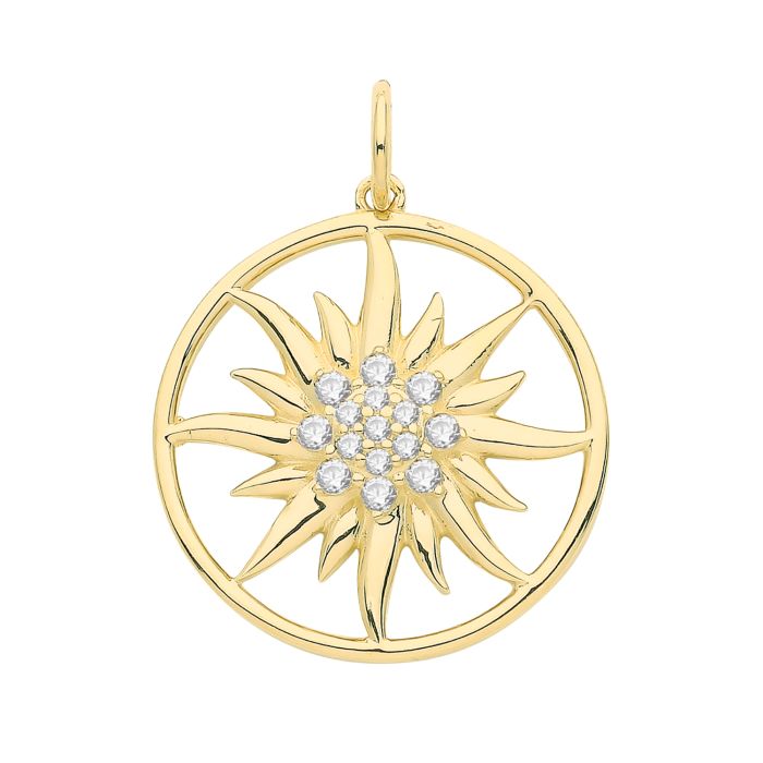 Description / 9ct Gold 17mm Round Cut Out Multi Cubic Zirconia Sun Pendant