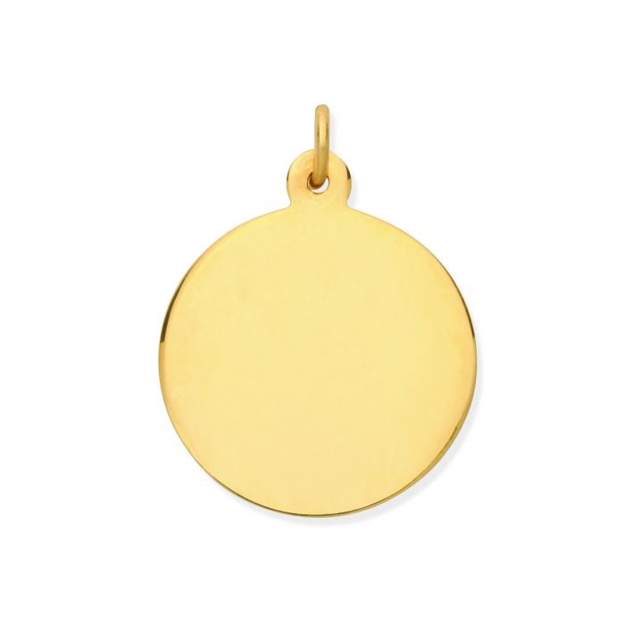 9ct gold 18mm plain engravable round disc dog tag pendant.Approximate pendant height 18mm (excluding bale) x width 18mm.Approximate pendant weight is 1.6 grams.If a chain is selected it will be a 9ct gold 1.2mm wide trace chain.The pendant will come to you in a black leatherette gift box with a World of Jewellery cleaning cloth.