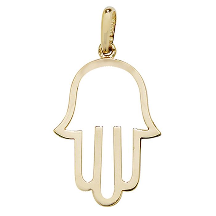 9ct gold 19mm plain cubic cut out hamas hand pendant.Approximate pendant height 19mm (excluding bale) x width 14mm.Approximate pendant weight is 0.45 grams.If a chain is selected it will be a 9ct gold 1.2mm wide trace chain.The pendant will come to you in a black leatherette gift box with a World of Jewellery cleaning cloth.
