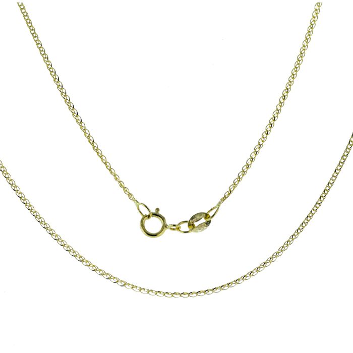 9ct gold 1mm diamond cut single link wheat spiga chain necklace.Available in lengths 16, 18 and 20 inch.Approximate chain weights are:16 inch = 0.9 grams.18 inch = 1 gram.20 inch = 1.1 grams.The chain will come to you in a black leatherette gift box with a World of Jewellery cleaning cloth.