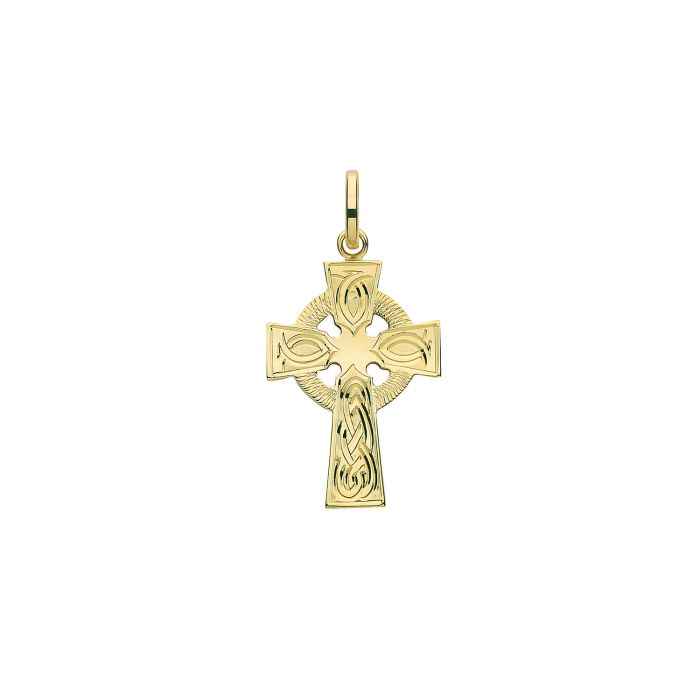 9ct gold 24mm semi solid celtic engraved cross necklace.Approximate pendant height 24mm (excluding bale) x width 16mm.Approximate pendant weight is 2.6 grams.If a chain is selected it will be a 9ct gold 1.2mm wide trace chain.The pendant will come to you in a black leatherette gift box with a World of Jewellery cleaning cloth.