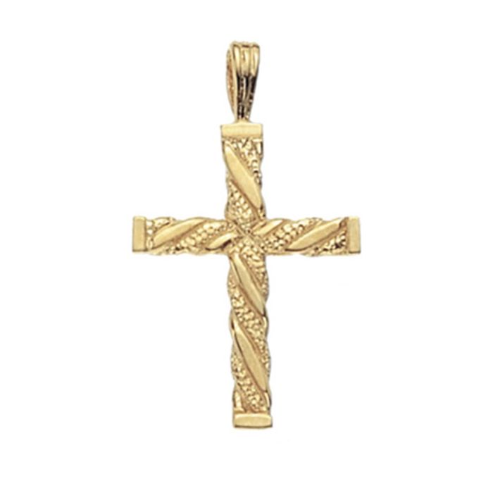 9ct gold 26mm square twist cross necklace.Approximate pendant height 26mm (excluding bale) x width 19mm.Approximate pendant weight is 2.7 grams.If a chain is selected it will be a 9ct gold 1.2mm wide trace chain.The pendant will come to you in a black leatherette gift box with a World of Jewellery cleaning cloth.