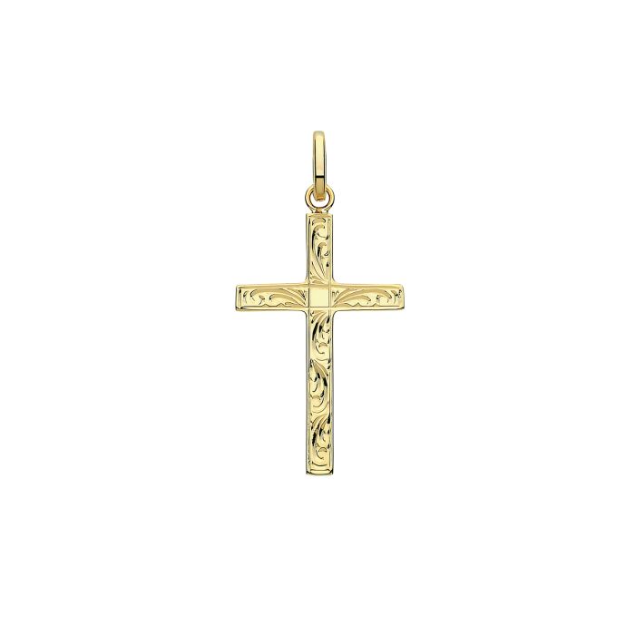 9ct gold 27mm semi solid engraved cross necklace.Approximate pendant height 27mm (excluding bale) x width 17mm.Approximate pendant weight is 2.1 grams.If a chain is selected it will be a 9ct gold 1.2mm wide trace chain.The pendant will come to you in a black leatherette gift box with a World of Jewellery cleaning cloth.