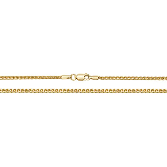 9ct gold 2mm spiga wheat chain necklace.Available in lengths 16, 18, 20, 22, 24, 26, 28 and 30 inch.Approximate chain weights are:16 inch = 4.4 grams.18 inch = 5 grams.20 inch = 5.6 grams.22 inch = 6.2 grams.24 inch = 6.8 grams.26 inch = 7.4 grams.28 inch = 8 grams.30 inch = 8.6 grams.The chain will come to you in a black leatherette gift box with a World of Jewellery cleaning cloth.