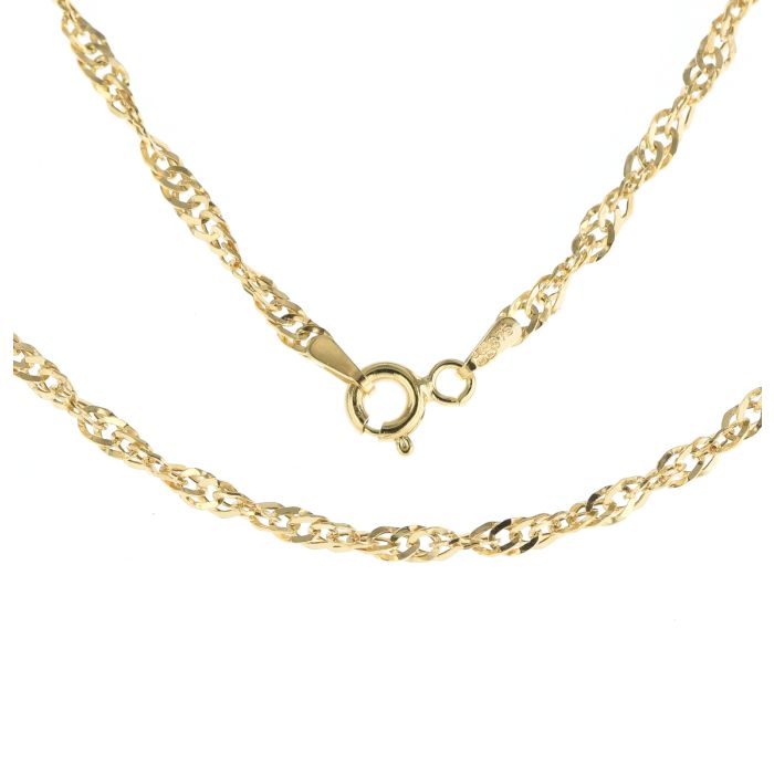 9ct gold 2mm tight twist singapore chain necklace.Available in lengths 16, 18, 20, 22 and 24 inch.Approximate chain weights are:16 inch = 1.5 grams.18 inch = 1.6 grams.20 inch = 1.7 grams.22 inch = 1.8 grams.24inch = 1.9 grams.The chain will come to you in a black leatherette gift box with a World of Jewellery cleaning cloth.
