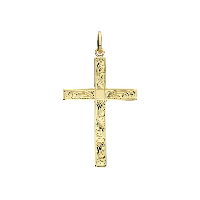 9ct gold 36mm semi solid engraved cross necklace.Approximate pendant height 36mm (excluding bale) x width 24mm.Approximate pendant weight is 3.5 grams.If a chain is selected it will be a 9ct gold 1.2mm wide trace chain.The pendant will come to you in a black leatherette gift box with a World of Jewellery cleaning cloth.