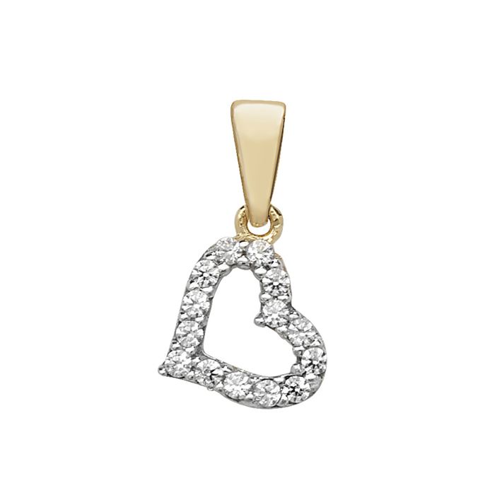 9ct gold 8mm cubic zirconia open heart pendant.Approximate pendant height 8mm (excluding bale) x width 9mm.Approximate pendant weight is 0.4 grams.If a chain is selected it will be a 9ct gold 1.2mm wide trace chain.The pendant will come to you in a black leatherette gift box with a World of Jewellery cleaning cloth.