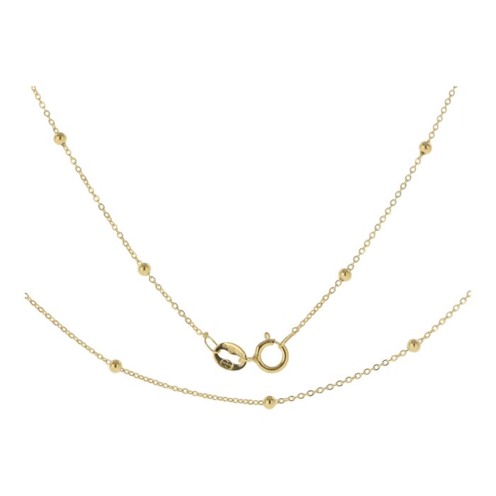 9ct yellow gold flat trace and 1.5mm bead chain necklace.Available in lengths 16, 18, 20, 22 and 24 inch.Approximate chain weights are:16 inch = 0.9 grams.18 inch = 1 grams.20 inch = 1.1 grams.22 inch = 1.2 grams.24 inch = 1.3 grams.The chain will come to you in a black leatherette gift box with a World of Jewellery cleaning cloth.