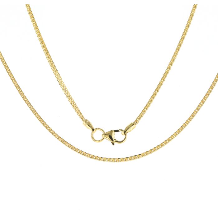 9ct gold spiga wheat 2mm chain necklace.Available in lengths 16, 18, 20, 22 and 24 inch.Approximate chain weights are:16 inch = 2.9 grams.18 inch = 3.2 grams.20 inch = 3.5 grams.22 inch = 3.8 grams.24 inch = 4.1 grams.The chain will come to you in a black leatherette gift box with a World of Jewellery cleaning cloth.