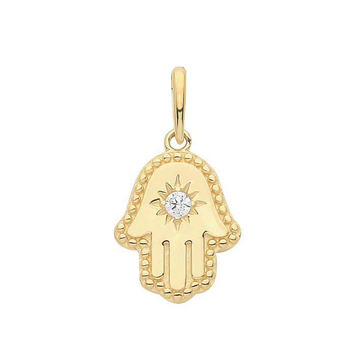 Boys 9ct gold 11mm single cubic zirconia fancy hamas hand pendant.Approximate pendant height 11mm (excluding bale) x width 9mm.Approximate pendant weight is 0.67 grams.If a chain is selected it will be a 9ct gold 1.1mm wide prince of wales chain.The pendant will come to you in a blue Kraft gift box made from 100% recycled material containing a white eco-fibre fill with a World of Jewellery cleaning cloth.