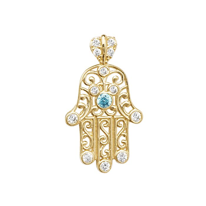 Boys 9ct gold 13mm blue cubic zirconia fancy hamas hand pendant.Approximate pendant height 13mm (excluding bale) x width 10mm.Approximate pendant weight is 0.49 grams.If a chain is selected it will be a 9ct gold 1.1mm wide prince of wales chain.The pendant will come to you in a blue Kraft gift box made from 100% recycled material containing a white eco-fibre fill with a World of Jewellery cleaning cloth.