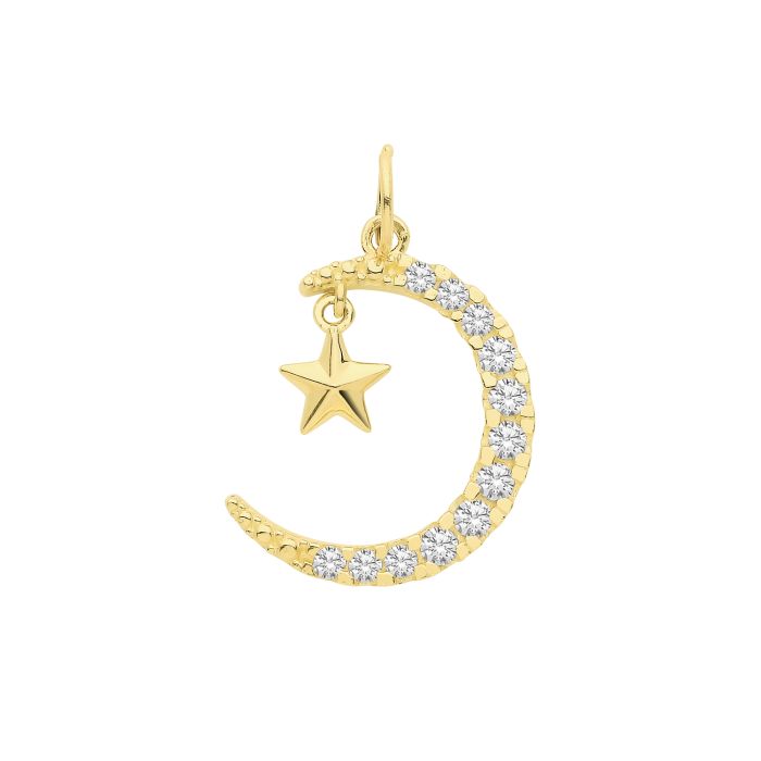 Boys 9ct gold 13mm cubic zirconia set cresent moon and star pendant.Approximate pendant height 13mm (excluding bale) x width 11mm.Approximate pendant weight is 0.5 grams.If a chain is selected it will be a 9ct gold 1.1mm wide prince of wales chain.The pendant will come to you in a blue Kraft gift box made from 100% recycled material containing a white eco-fibre fill with a World of Jewellery cleaning cloth.