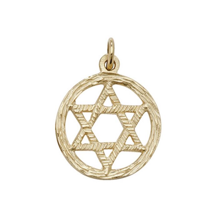 Boys 9ct gold 14mm plain round star of david pendant.Approximate pendant height 14mm (excluding bale) x width 14mm.Approximate pendant weight is 1.3 grams.If a chain is selected it will be a 9ct gold 1.1mm wide prince of wales chain.The pendant will come to you in a blue Kraft gift box made from 100% recycled material containing a white eco-fibre fill with a World of Jewellery cleaning cloth.