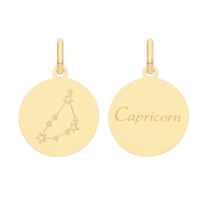 Boys 9ct gold 18mm double sided round disc capricorn zodiac and constellation pendant.Approximate pendant height 18mm (excluding bale) x width 18mm.Approximate pendant weight is 1.45 grams.If a chain is selected it will be a 9ct gold 1.1mm wide prince of wales chain.The pendant will come to you in a blue Kraft gift box made from 100% recycled material containing a white eco-fibre fill with a World of Jewellery cleaning cloth.