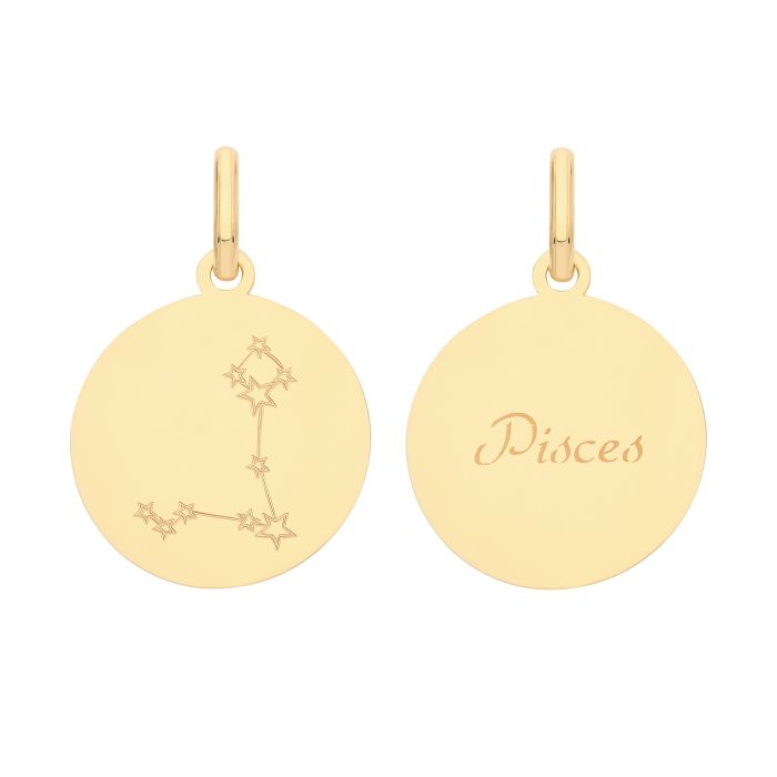 Boys 9ct gold 18mm double sided round disc pisces zodiac and constellation pendant.Approximate pendant height 18mm (excluding bale) x width 18mm.Approximate pendant weight is 1.45 grams.If a chain is selected it will be a 9ct gold 1.1mm wide prince of wales chain.The pendant will come to you in a blue Kraft gift box made from 100% recycled material containing a white eco-fibre fill with a World of Jewellery cleaning cloth.