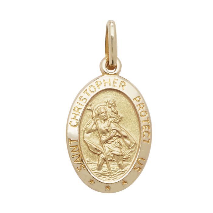 Boys 9ct gold 18mm plain oval engravable back st christopher pendant.