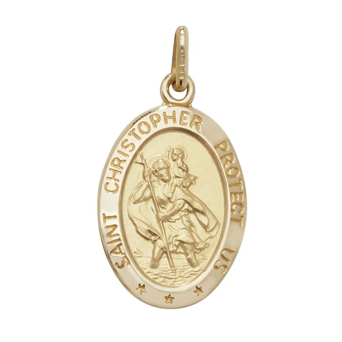 Boys 9ct gold 21mm plain oval engravable back st christopher pendant.