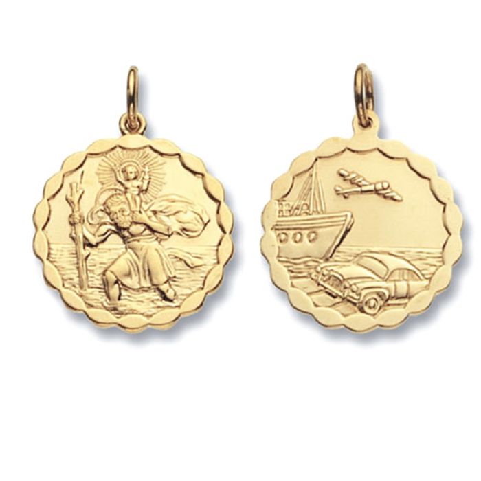 Boys 9ct gold 24mm double sided plain round st christopher pendant.Approximate pendant height 24mm (excluding bale) x width 24mm.Approximate pendant weight is 6.5 grams.If a chain is selected it will be a 9ct gold 1.1mm wide prince of wales chain.The necklace will come to you in a black leatherette gift box with a World of Jewellery cleaning cloth.