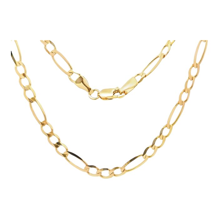 9ct gold 3.4mm figaro chain necklace.Available in lengths 16, 18, 20, 22, 24, 26, 28 and 30 inch.Approximate chain weights are:16 inch = 4.6 grams.18 inch = 5.1 grams.20 inch = 5.7 grams.22 inch = 6.3 grams.24 inch = 6.9 grams.26 inch = 7.5 grams.28 inch = 8 grams.30 inch = 8.7 grams.The chain will come to you in a blue Kraft gift box made from 100% recycled material containing a white eco-fibre fill with a World of Jewellery cleaning cloth.