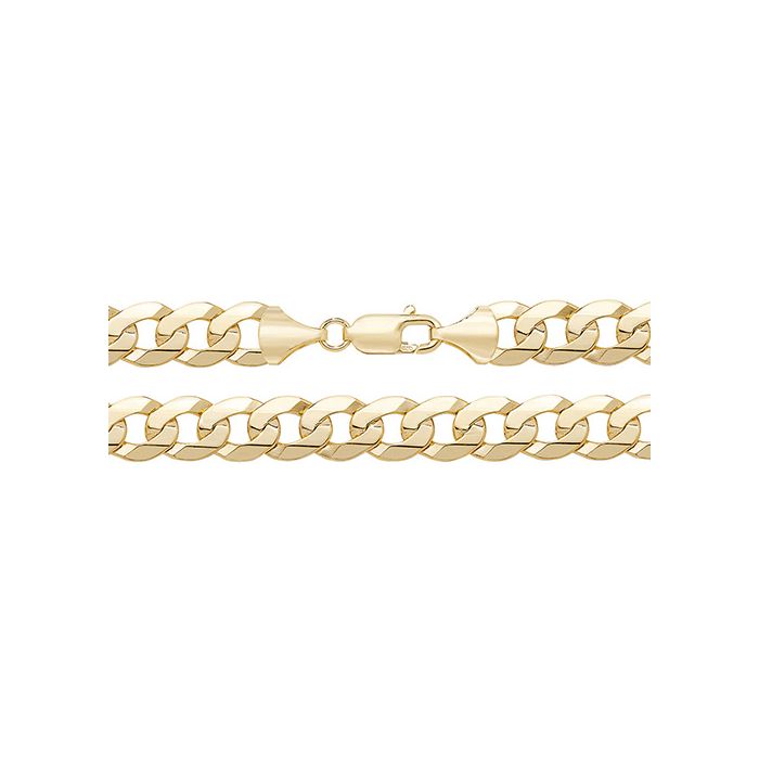 9ct gold 10mm flat bevelled curb chain necklace.Available in lengths 20, 22 and 24 inch.Approximate chain weights are:20 inch = 51 grams.22 inch = 56.1 grams.24 inch = 61.2 grams.The chain will come to you in a pink Kraft gift box made from 100% recycled material containing a white eco-fibre fill with a World of Jewellery cleaning cloth.