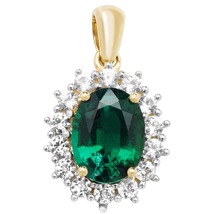 Girls 9ct gold 14mm created emerald and white sapphire oval pendant.Approximate pendant height 14mm (excluding bale) x width 12mm.Approximate pendant weight is 2 grams.If a chain is selected it will be a 9ct gold 1.1mm wide prince of wales chain.The pendant will come to you in a pink Kraft gift box made from 100% recycled material containing a white eco-fibre fill with a World of Jewellery cleaning cloth.