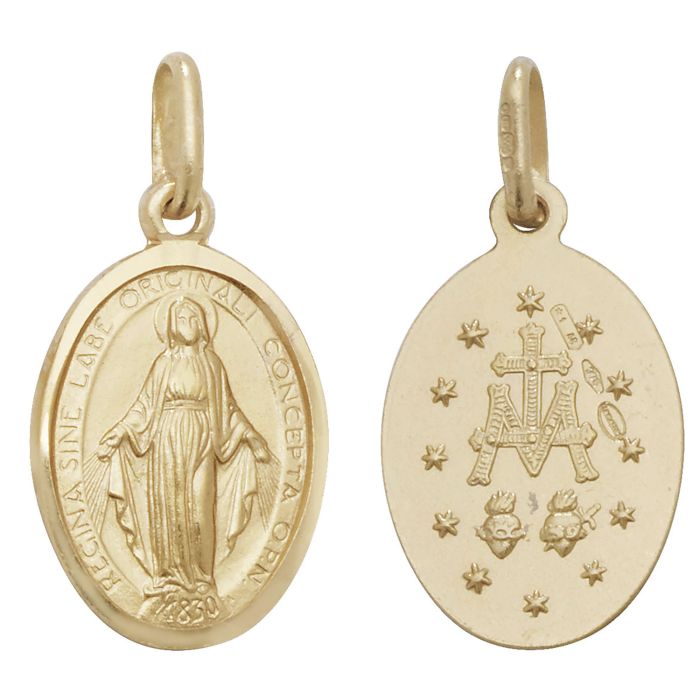 Girls 9ct gold 17mm plain double sided oval miraculous pendant.Approximate pendant height 17mm (excluding bale) x width 13mm.Approximate pendant weight is 1.8 grams.If a chain is selected it will be a 9ct gold 1.1mm wide prince of wales chain.The necklace will come to you in a black leatherette gift box with a World of Jewellery cleaning cloth.