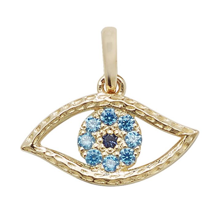 Girls 9ct gold 8mm blue cubic zirconia evil eye pendant.Approximate pendant height 8mm (excluding bale) x width 15mm.Approximate pendant weight is 0.51 grams.If a chain is selected it will be a 9ct gold 1.1mm wide prince of wales chain.The pendant will come to you in a pink Kraft gift box made from 100% recycled material containing a white eco-fibre fill with a World of Jewellery cleaning cloth.