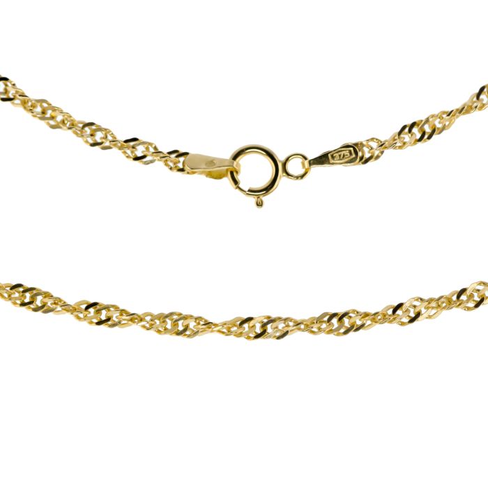 9ct gold singapore 2mm chain necklace.Available in lengths 16, 18, 20, 22 and 24 inch.Approximate chain weights are:16 inch = 2.8 grams.18 inch = 3.2 grams.20 inch = 3.6 grams.22 inch = 4 grams.24inch = 4.3 grams.The chain will come to you in a pink Kraft gift box made from 100% recycled material containing a white eco-fibre fill with a World of Jewellery cleaning cloth.