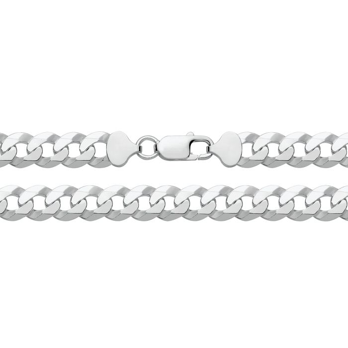 Sterling silver 10mm flat bevelled curb chain necklace.Available in lengths 20, 22, 24, 26, 28 and 30 inch.Approximate chain weights are:20 inch = 40.7 grams.22 inch = 44.8 grams.24 inch = 48.9 grams.26 inch = 52.9 grams.28 inch = 57 grams.30 inch = 61 grams.The chain will come to you in a pink Kraft gift box made from 100% recycled material containing a white eco-fibre fill with a World of Jewellery cleaning cloth.