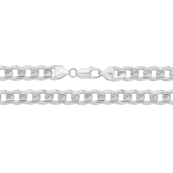 Sterling silver 10mm pave curb chain necklace.Available in lengths 20, 22 and 24 inch.Approximate chain weights are:20 inch = 61.6 grams.22 inch = 67.7 grams.24 inch = 73.9 grams.The chain will come to you in a pink Kraft gift box made from 100% recycled material containing a white eco-fibre fill with a World of Jewellery cleaning cloth.