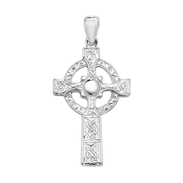 Sterling silver 32mm high celtic cross necklace.Pendant Height 32mm x Width 21mm.Approximate pendant weight 3.8 grams.This pendant will be supplied on a black leather cord necklace.The necklace will come to you in a black leatherette gift box and an Amandas Silver Boutique jewellery polishing cloth.