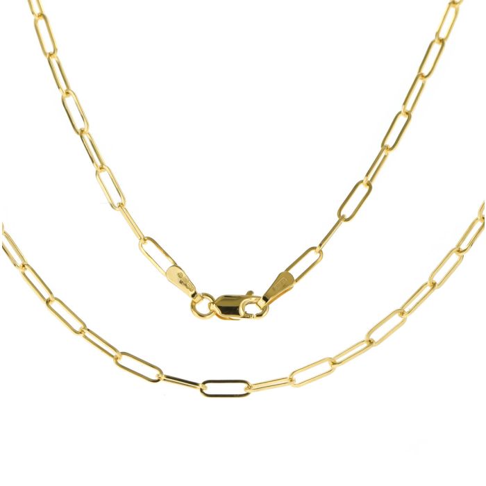 9ct gold 2mm paper clip chain necklace.Available in lengths 16, 18, 20, 22 and 24 inch.Approximate chain weights are:16 inch = 2.5 grams.18 inch = 2.8 grams.20 inch = 3.2 grams.22 inch = 3.5 grams.24 inch = 3.8 grams.The chain will come to you in a black leatherette gift box with a World of Jewellery cleaning cloth.