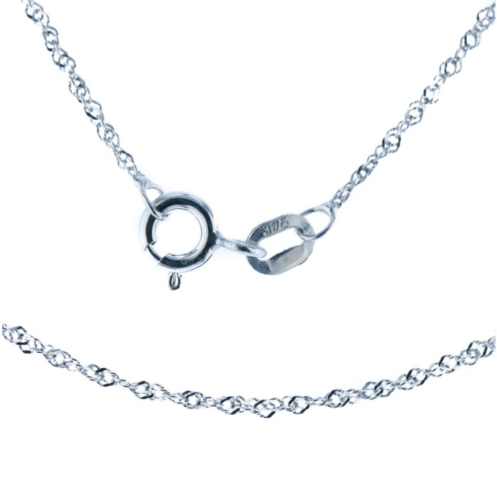 9ct white gold 1mm diamond cut chain necklace.Available in lengths 16, 18 and 20 inch.Approximate chain weights are:16 inch = 1 grams.18 inch = 1.1 grams.20 inch = 1.2 grams.The chain will come to you in a black leatherette gift box with a World of Jewellery cleaning cloth.
