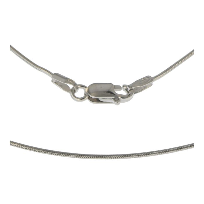9ct white gold 1mm round snake chain necklace.Available in lengths 16 and 18 inch.Approximate chain weights are:16 inch = 2.3 grams.18 inch = 2.5 grams.The chain will come to you in a black leatherette gift box with a World of Jewellery cleaning cloth.